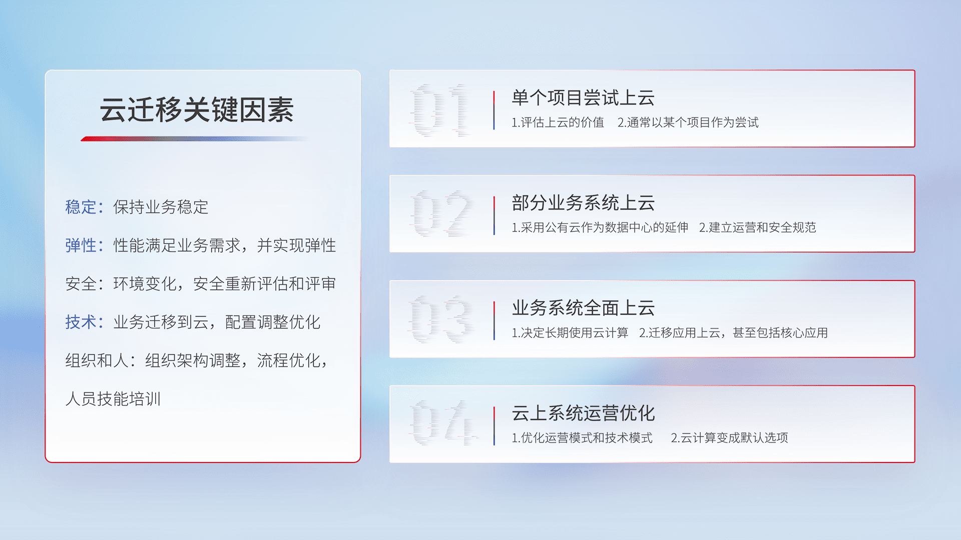 结合实际业务,,,从规划设计、、云平台选型、、、、云原生改造、、、数据迁移、、、集成交付,,迁移全过程为客户识别最佳上云路径,,,做好风险识别管理,,,设计网络架构、、身份权限、、、安全审计合规、、、、操作审计、、、日志审计、、、、监控告警策略、、多站点容灾设计等,,,,对云上基础设施进行整体规划,,,提升IT治理水平,,,,以满足弹性、、、高可用、、、、高性能的需求。。。