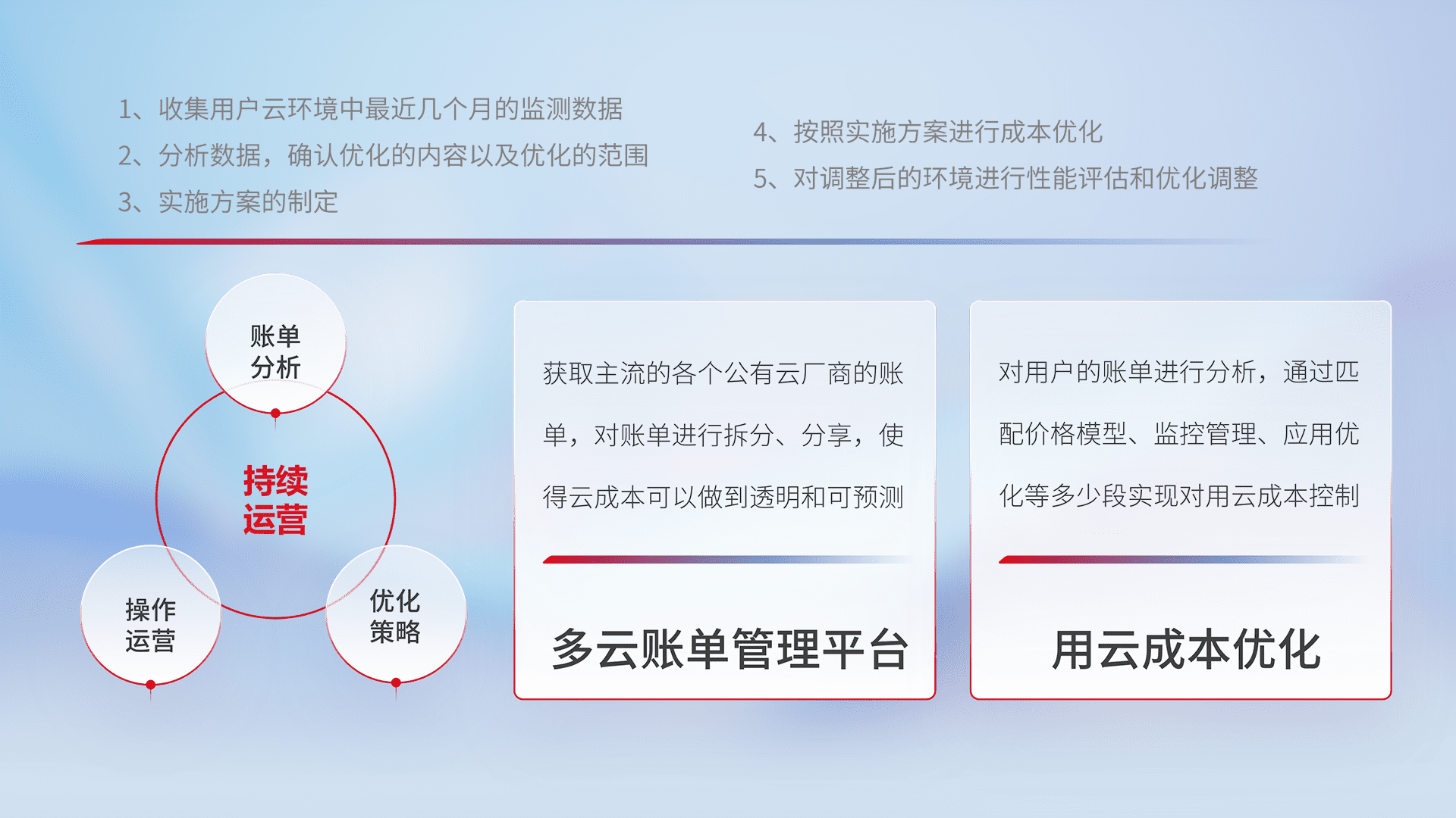 通过多云纳管,,,以统一的资源数据模型把客户的云资源进行抽象和封装,,,,进而实现对多云资源的统一操作,,,保障云资源管理的可靠性、、稳定性与可用性。。。量身定制化运维内容,,,,配置、、、开发运维、、、补丁管理、、、、备份、、、、监控、、、、认证和访问管理、、、审计和日常巡检等,,,保障在用云过程中的可靠度,,,稳定度以及高可用率。。